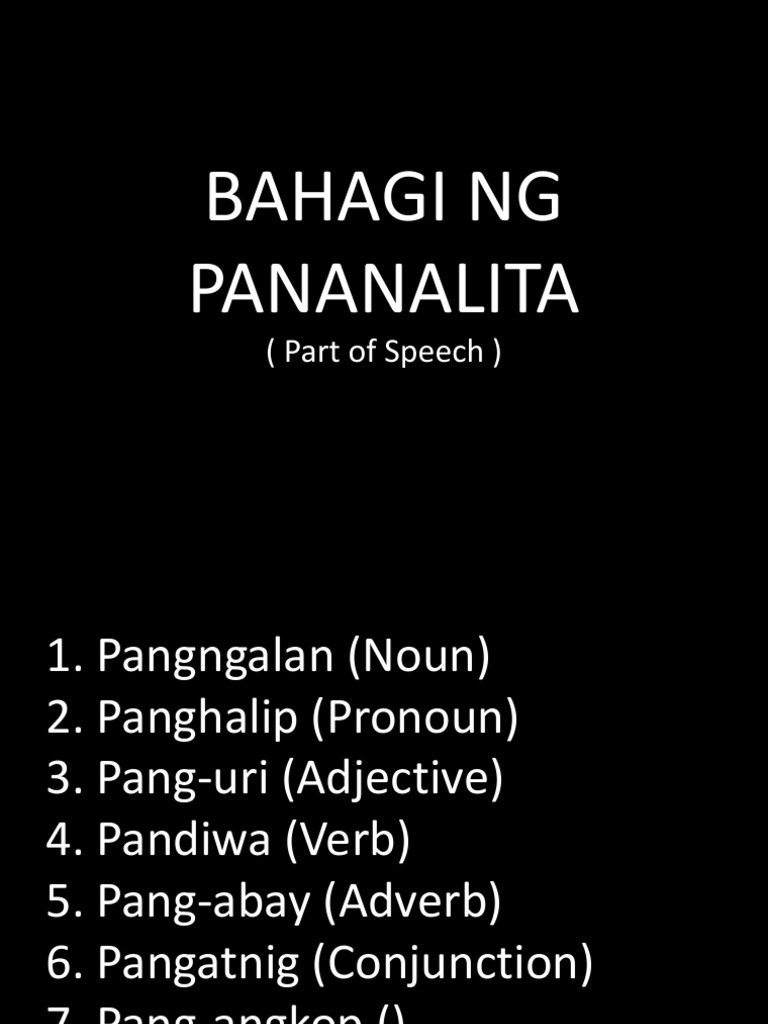 Mga Bahagi Ng Pananalita from image.slidesharecdn.com Mga bahagi pananalita, walong bahagi ng pananalita chart, walong sa balarila, ang bahagi ng pananalita/panalita (sa ingles: Bahagi ng pananalita at cram.com. Ang bahagi ng pananalita ay kilala rin sa tawag na parts of speech sa wikang ingles. Ang bahagi ng pananalita (part of speech)ay isang lingguwistikong kauriang panleksiko ng mga salita o bahaging panleksiko na pangkalahatang binibigyang kahulugan sa pamamagitan ng morpolohikong asal. Mga salitang nagsasaad ng pangalan ng tao, hayop, bagay, pook, katangian, pangyayari, atbp. Simply click on the download link below the image to get your free and direct copy. Mga bahagi ng pananaliksik ang mga bahaging ito ng pananaliksik, ang nagbibigay linaw sa mga hakbangin o prosesong dapat sundin sa gawaing pananaliksik. Mga uri ng panagano ng pandiwa 1.